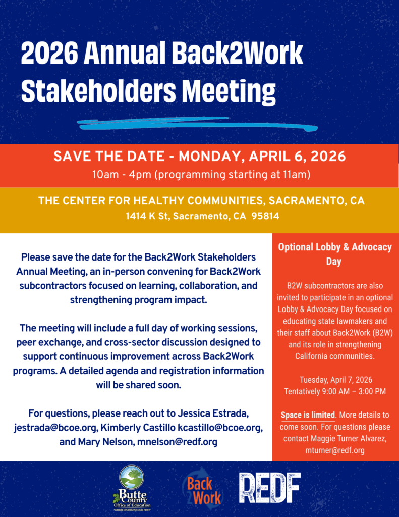 The Back 2 Work (B2W) program, an innovative partnership with Butte County Office of Education and Caltrans, contracts with employment social enterprises and nonprofit organizations to connect individuals overcoming barriers to employment—including experiences of incarceration and homelessness—with jobs, training, and support. B2W has expanded to over 40 counties in California, serving more than 6,500 people annually.